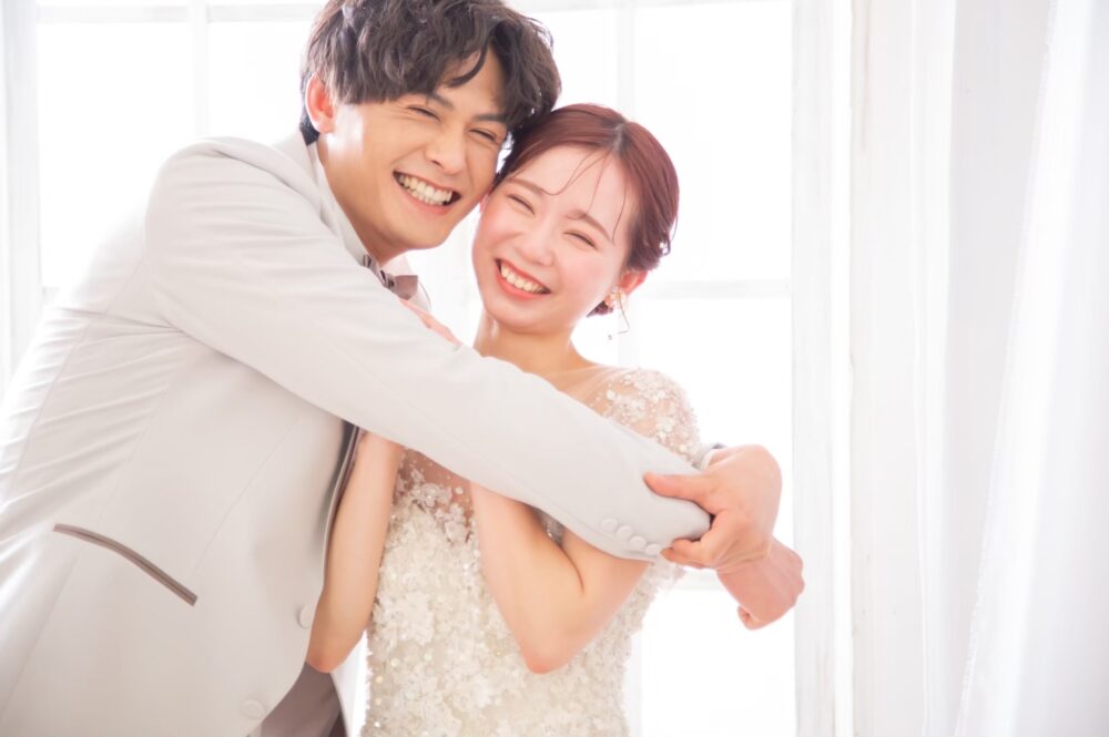 このポーズはお婿様がお嫁様にハグしているシーンを撮ったものです!恥ずかしさもあると思いますが、お二人の照れた表情や満面の笑みがとても可愛らしくてお写真として残るだけでなく思い出にも残るとっておきのポーズになっています✨