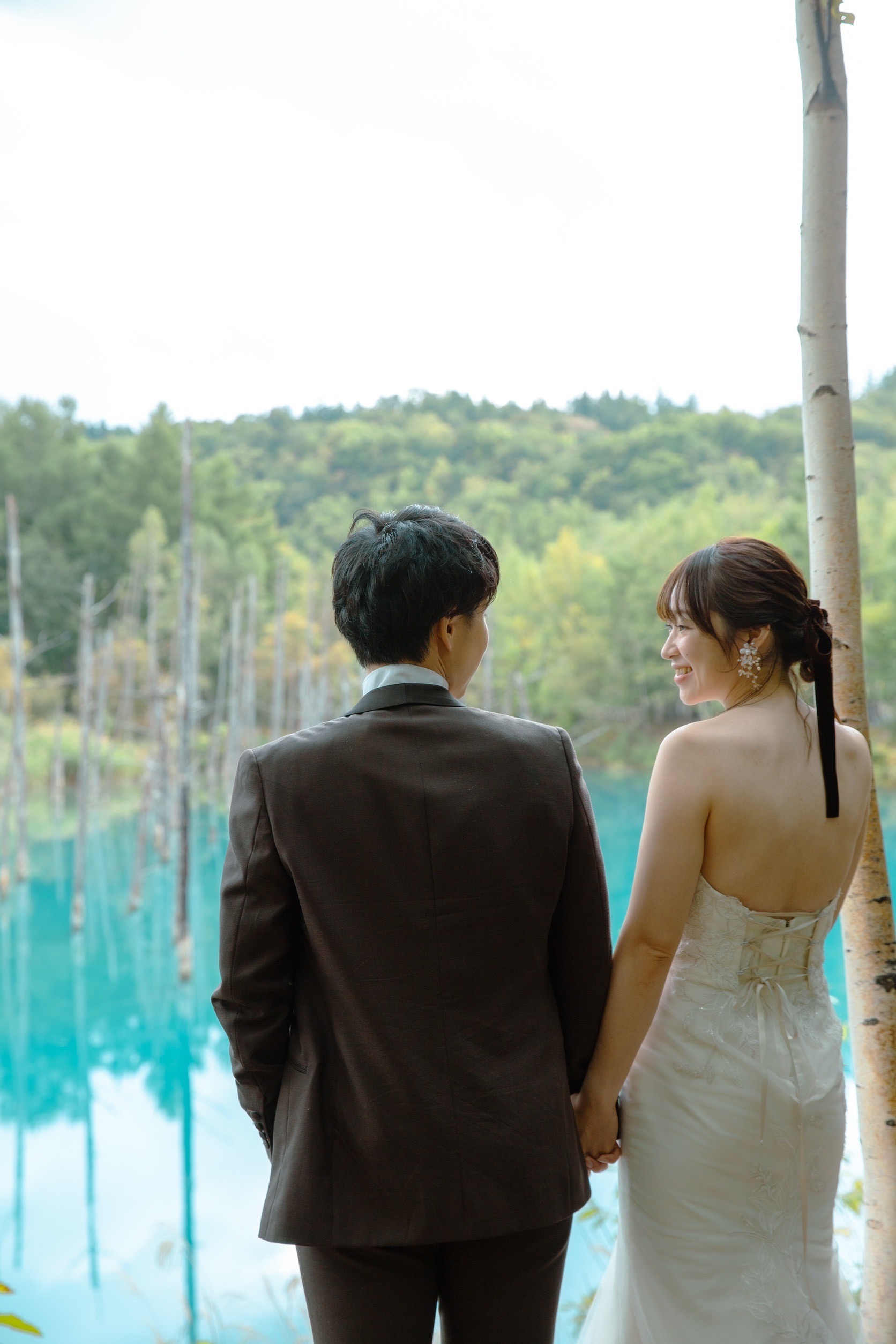 青い池ならではのこの鮮やかなお色味が素敵なドレスを引き立ててくれます✨