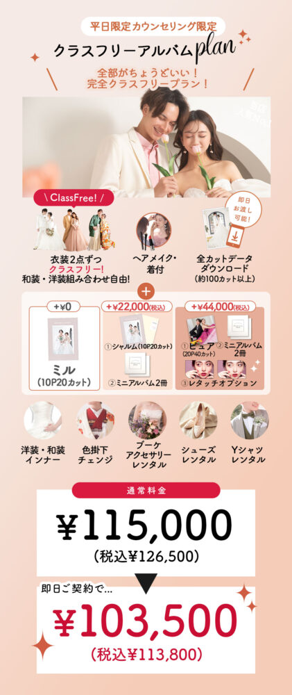 平日のカウンセリングでご契約できちゃうクラスフリーアルバムプラン♪