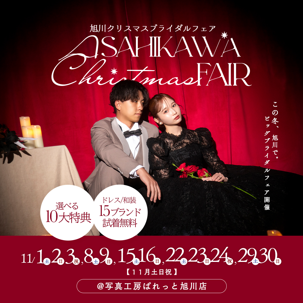北海道旭川市のフォトウェディングスタジオ、写真工房ぱれっと旭川店です。この度、2025年11月の毎週末に【旭川ブライダルフェア】の開催が決定いたしました!! 最新衣装の見学&無料試着会や、嬉しいプレゼント、限定特別プランを多数ご用意しております! 是非、大切な方をお誘い合わせの上ご来場をお待ちしております♡