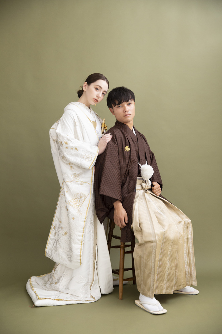 全体的にくすみ系のカラーで統一された色味は、とってもおしゃれで今どきな雰囲気。差し込む柔らかい光が、幸せなお二人を優しく照らします。 華やかな色打掛や白無垢などの和装はもちろん、ウェディングドレスやカラードレスも素敵に映える、旭川店こだわりの背景です。