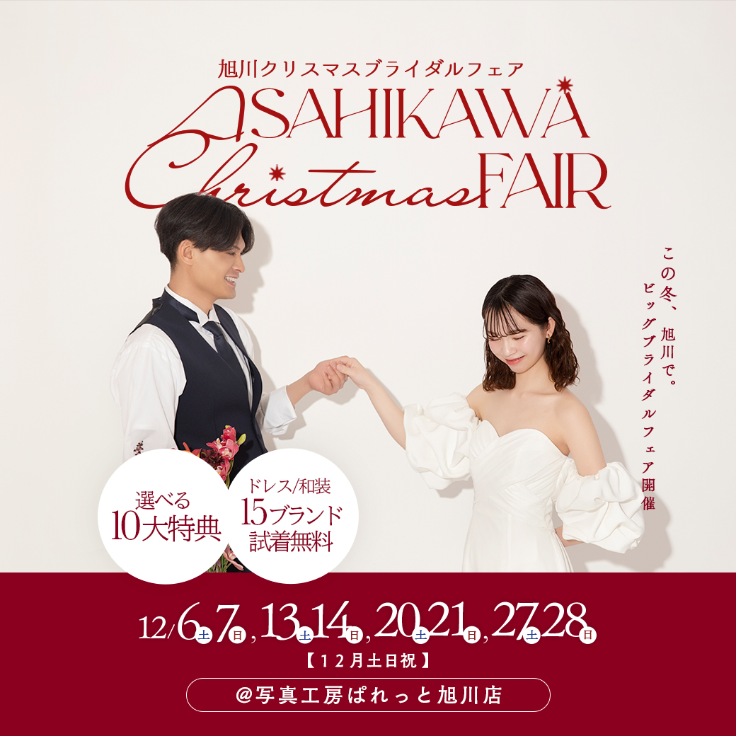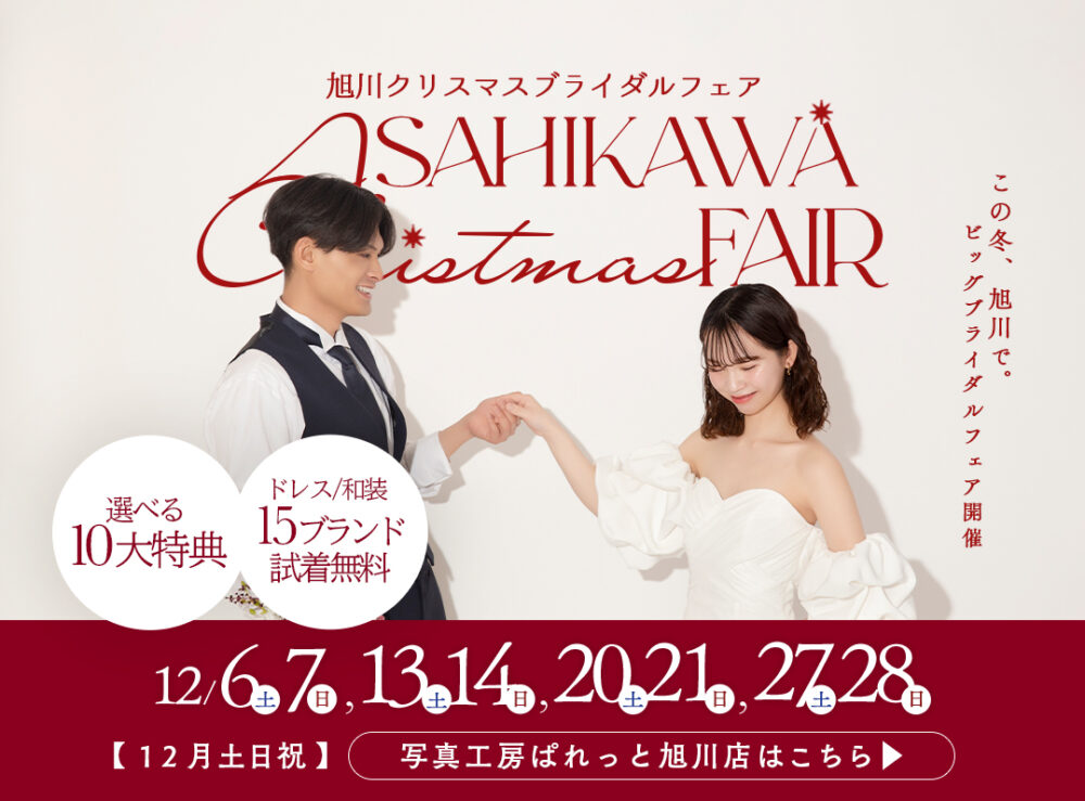 北海道旭川市のフォトウェディングスタジオ、写真工房ぱれっと旭川店です。この度、2025年12月の毎週末に【旭川ブライダルフェア】の開催が決定いたしました!! 最新衣装の見学&無料試着会や、嬉しいプレゼント、限定特別プランを多数ご用意しております! 是非、大切な方をお誘い合わせの上ご来場をお待ちしております♡