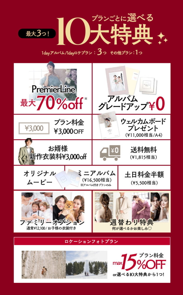 ⚠️PremierLine最大70%OFFは1dayアルバムプランの場合の追加料金¥40,000から最大70%OFF(¥28,000割引)でのご提供となります。