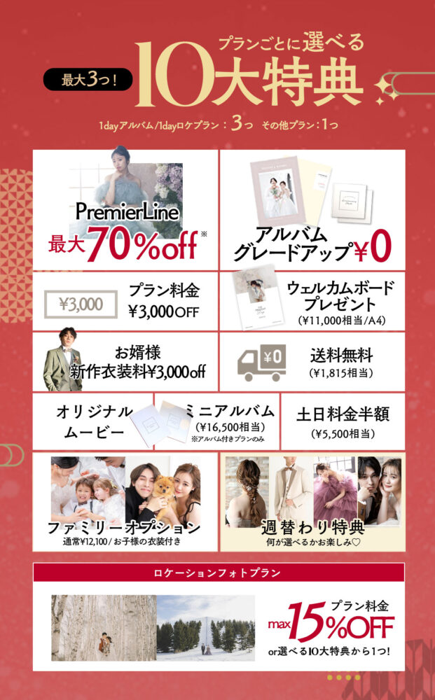 ⚠️PremierLine最大70%OFFは1dayアルバムプランの場合の追加料金¥40,000から最大70%OFF(¥28,000割引)でのご提供となります。