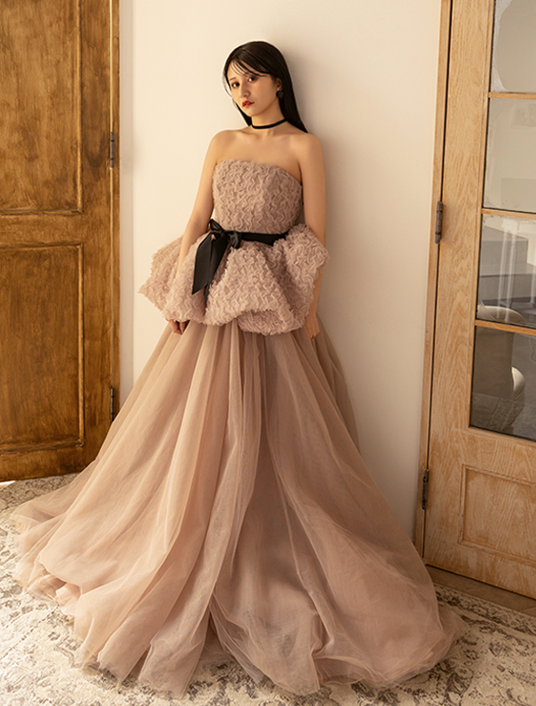 当スタジオの衣装コレクションでも、ベージュ、スモーキーピンク、ブルーグレーなど、絶妙な色合いのドレスを多数取り揃えております。派手すぎないのに、写真に映えるとゲストや新郎様からも大好評なんですよ。