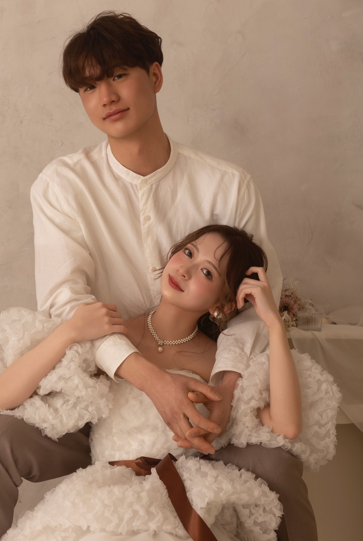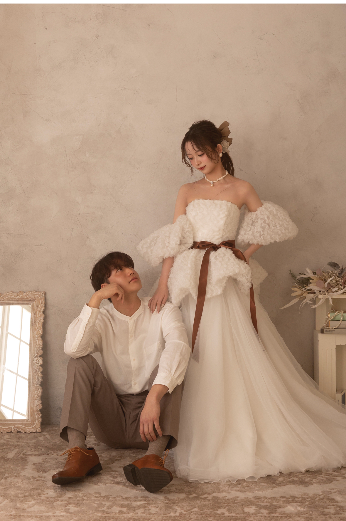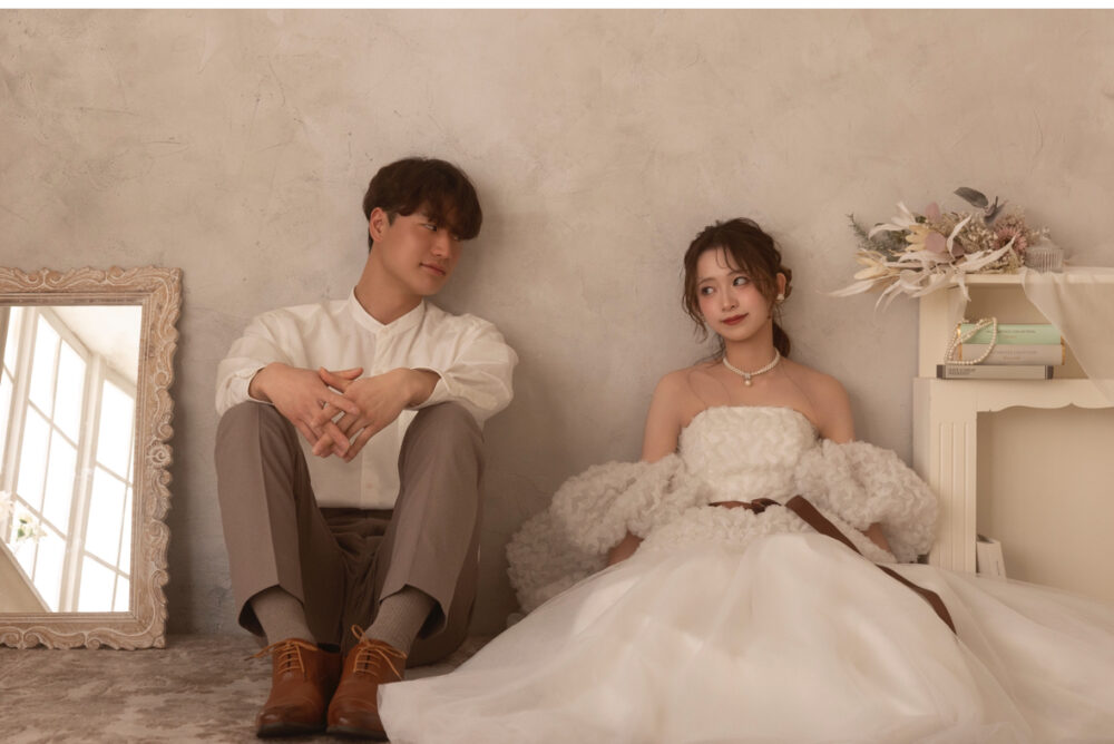 一方、お姫様のようなボリューム感が魅力のプリンセスラインは、広いスタジオでの撮影でも抜群の存在感を放ちます。当スタジオの衣装コレクションでも、繊細なレースをあしらったAラインや、何層にもチュールを重ねたプリンセスラインは常に高い人気を誇っています。