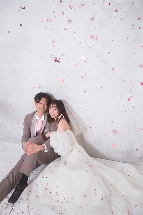 風に吹かれてヘアスタイルが崩れる心配もないので、お気に入りのウェーブも、繊細な後れ毛も、一番綺麗な状態を写真に残せますよ。当店のスタジオは、どの角度から撮っても絵になる背景を揃えています。