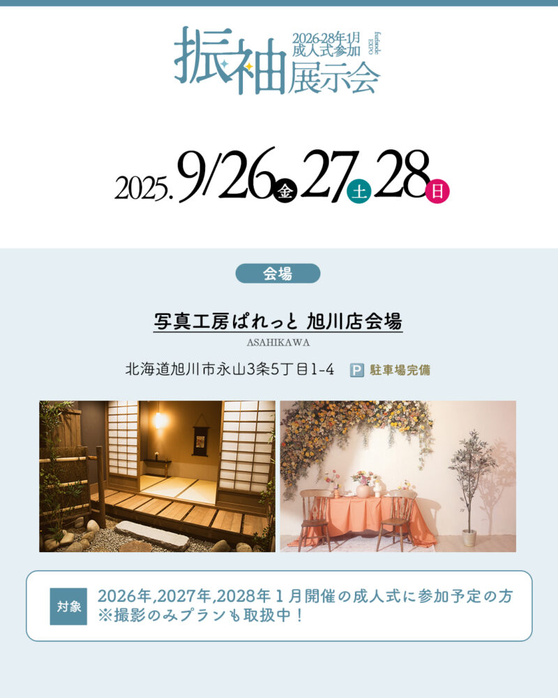 こんにちは! 写真工房ぱれっと旭川店です! 2025年9月26日(金)、27日(土)、28日(日)は 旭川振袖展示会を開催致します!