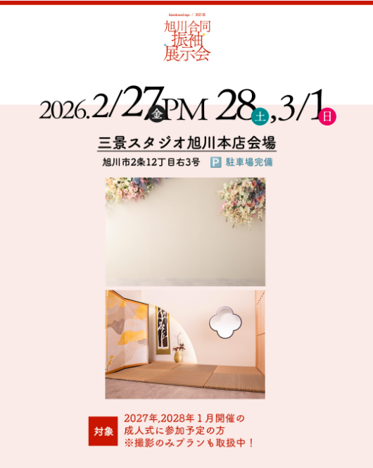 こんにちは! 北海道旭川市にある写真スタジオ「写真工房ぱれっと旭川店」です! 2/27pm(金),2/28(土)&3/1(日)の3日間限定で旭川合同展示会の開催が決定いたしました! 対象者は、2027年、2028年1月開催の成人式に参加予定の方! 成人式は一生に一度の大切な節目。 その日に纏う振袖は、本人にとっても家族にとっても忘れられない思い出になります。 ※撮影のみプランも取扱中。