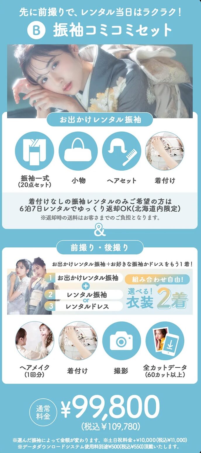 内容: 当日レンタル一式、前撮り(振袖+ドレスなど2着)、ヘアメイク、着付け、データ60カット以上
