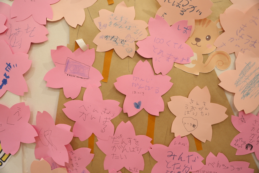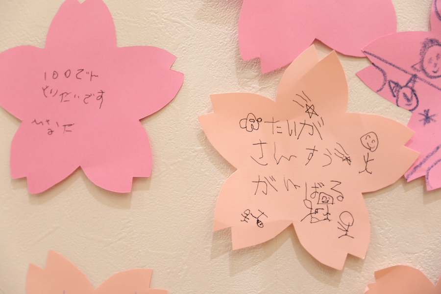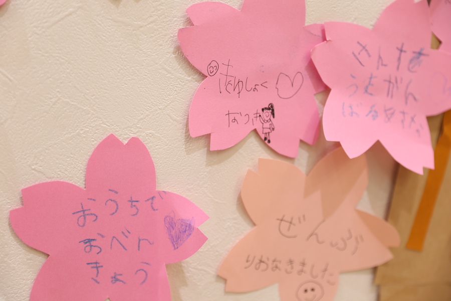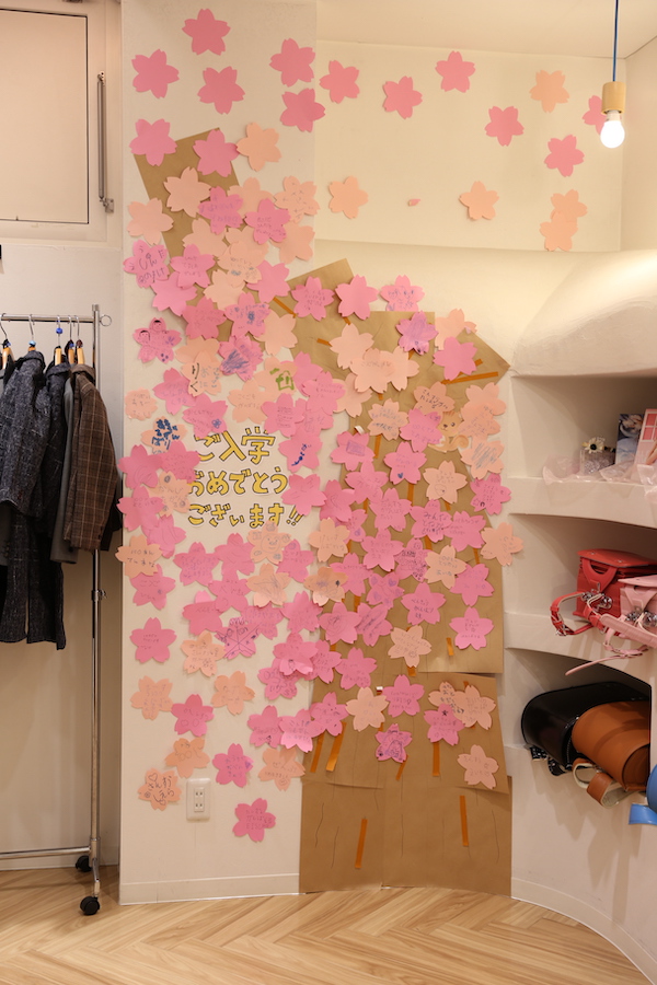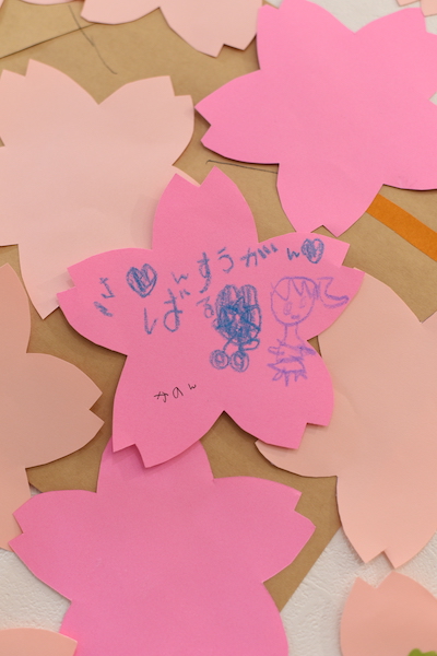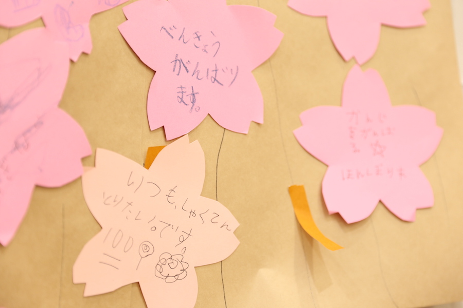 桜の花びらの紙に1年生になったらやりたいことを書いてもらいお店が桜でいっぱいになりました!