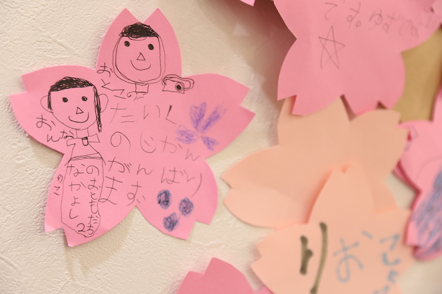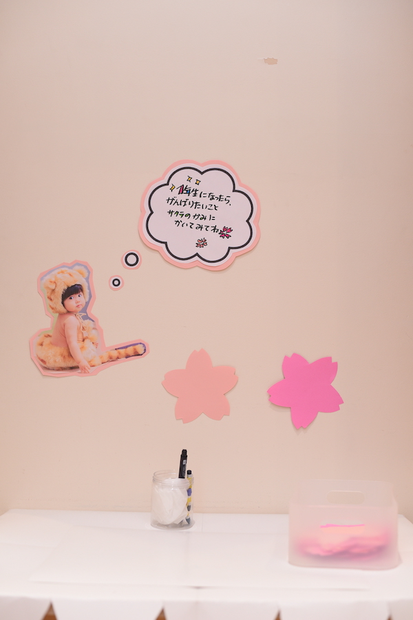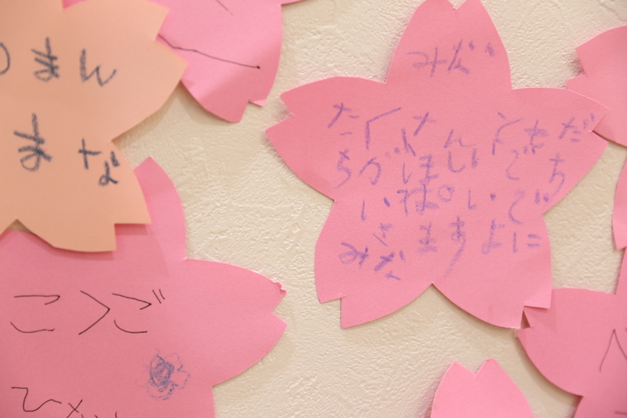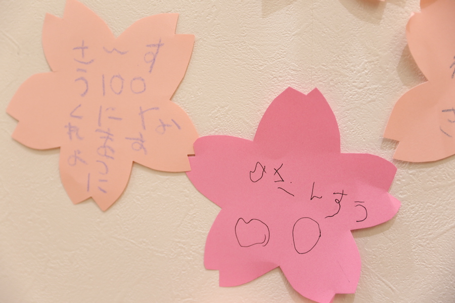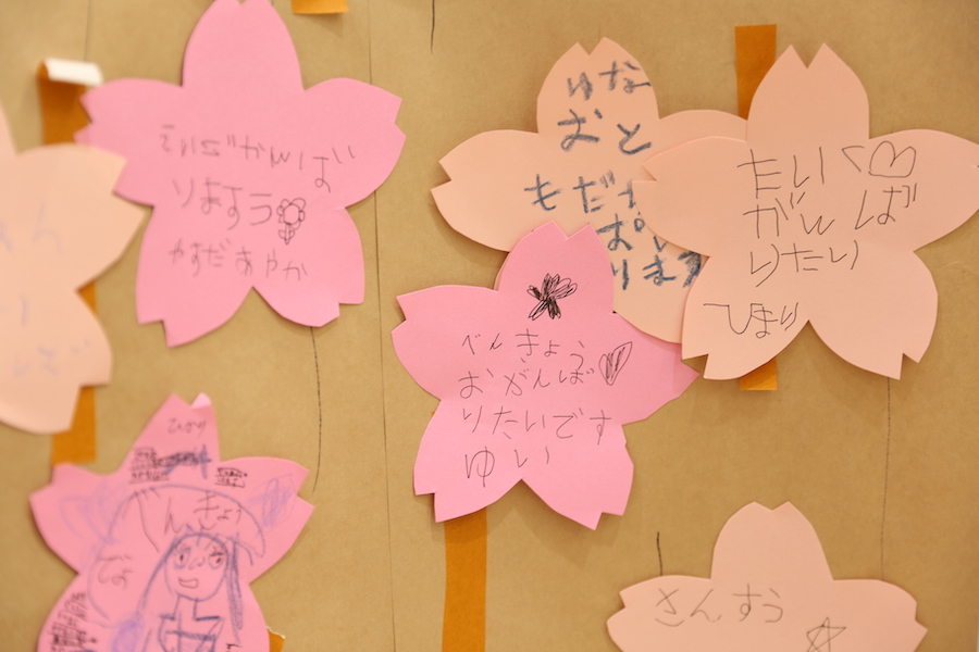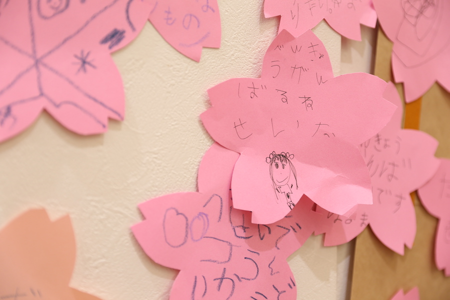 桜の花びらの紙に1年生になったらやりたいことを書いてもらいお店が桜でいっぱいになりました!