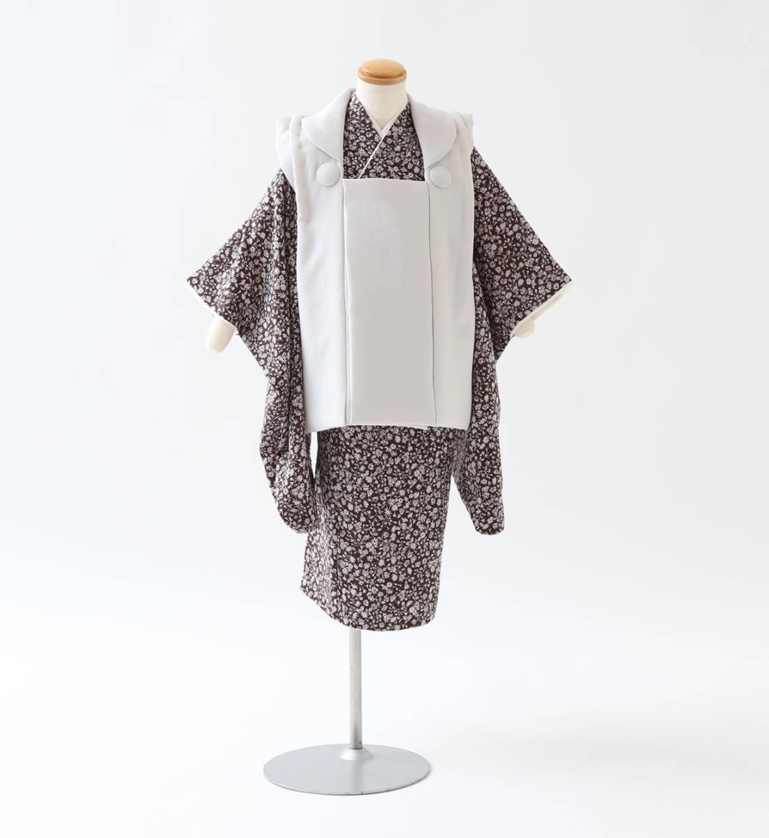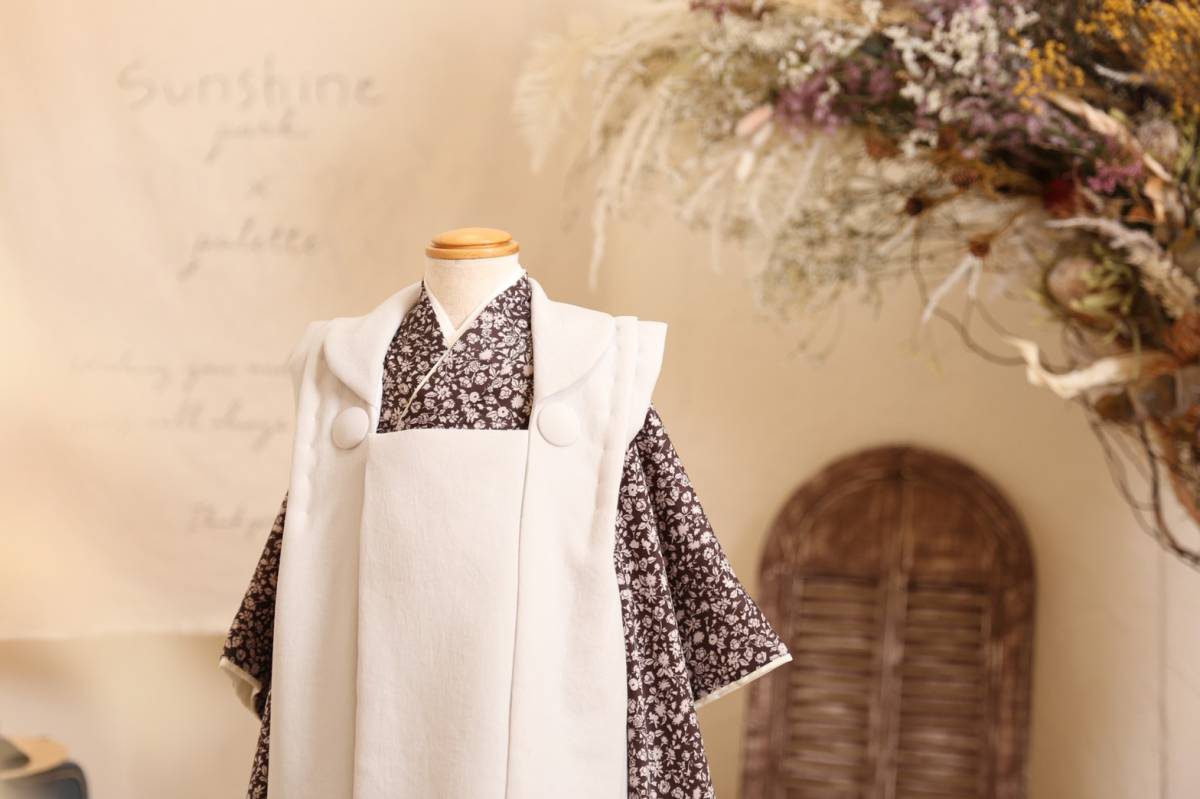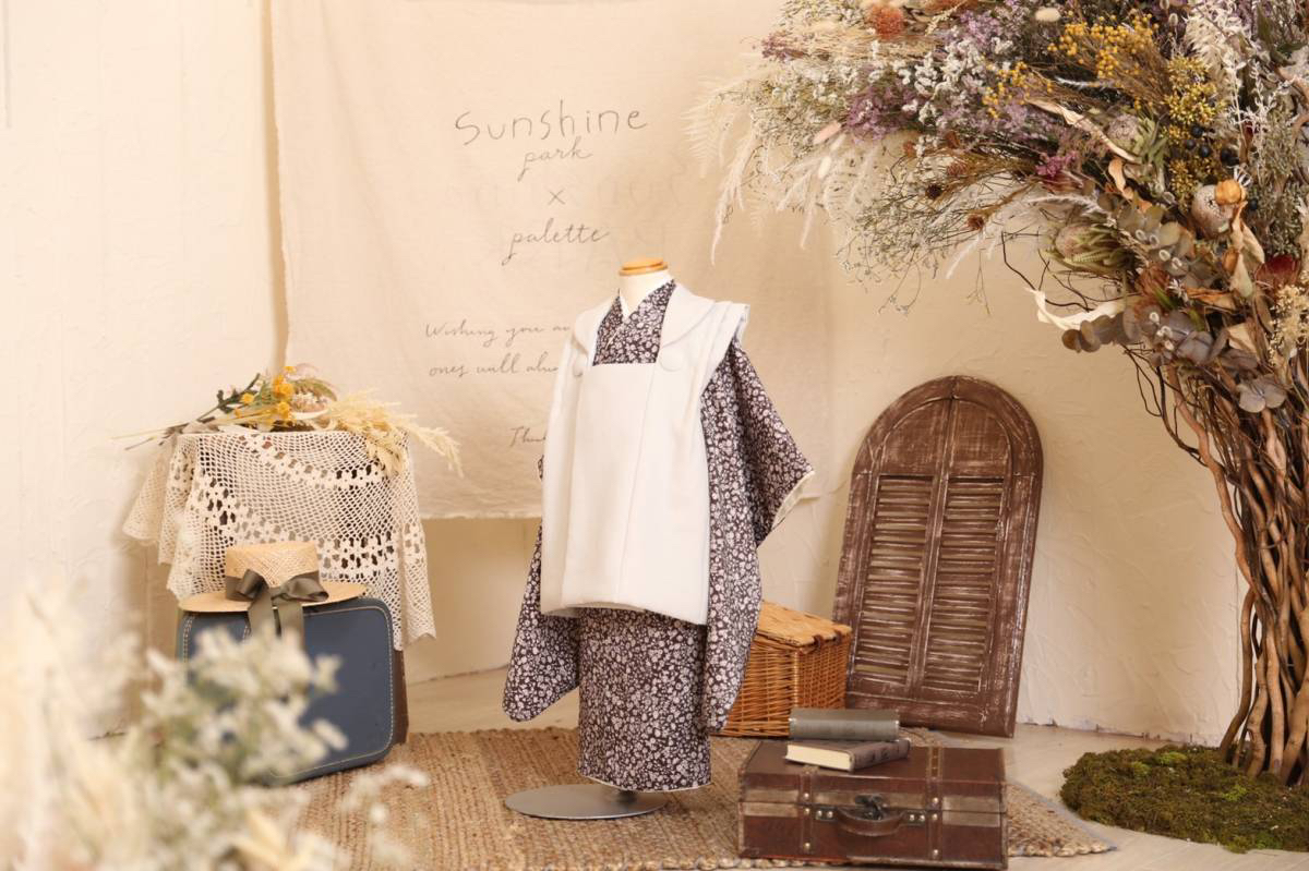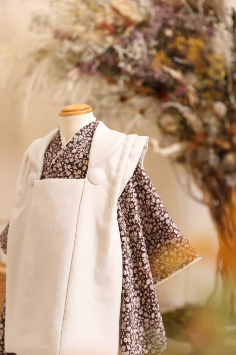 七五三3歳 新作和装が入荷しました!! 新背景*ピクニック*と相性抜群のボタニカル柄の着物! こちらは男女兼用ですよ♪ イマドキ和装を新しいおしゃれな背景で撮影しましょう!!