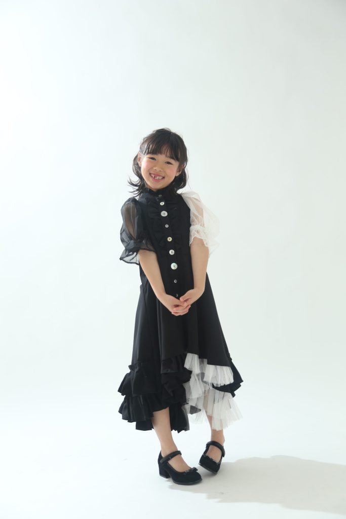 袖と裾のギャザーフリルがアシンメトリーのモノトーン。