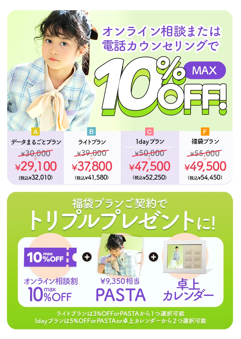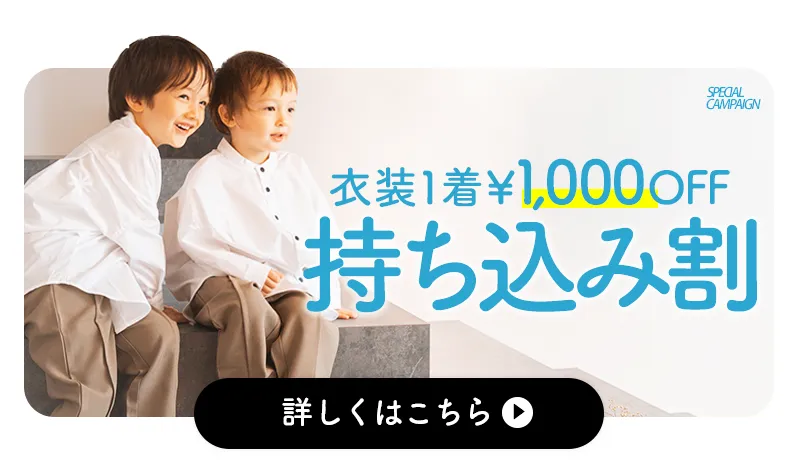 衣装持ち込み割引: 卒園式で着た制服などをご持参いただくと、1着につき1,000円割引(最大2着2,000円まで) 。