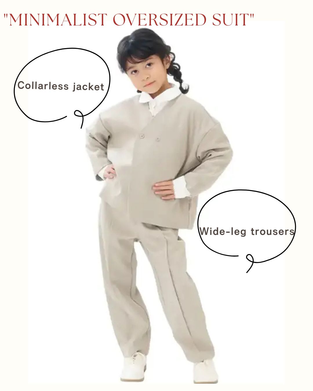 ミニマリストスタイル: 襟のないジャケットとワイドパンツの組み合わせが、今っぽくリラックスした雰囲気を出してくれます。