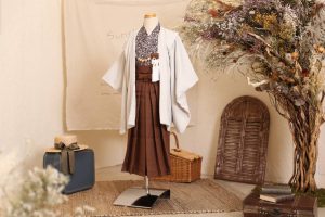 七五三5歳 新作和装が入荷しました!! カジュアな色合いの羽織と袴の組み合わせに、ボタニカル柄の着物! 新背景*ピクニック*で撮るととってもオシャレです♪