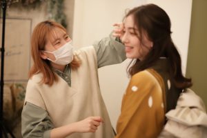 写真スタジオでのヘアメイク、ドレスフィッティング、アクセサリーコーディネート、