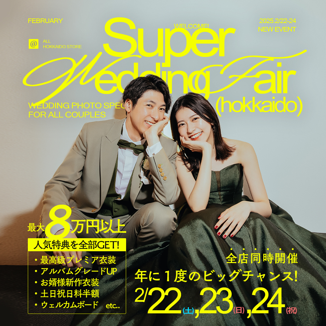 2025年2月22日-24日のスーパーウエディングフェアのご案内。全道で同時開催する大型イベントです!年に一度のスーパーブライダルフェアをお楽しみください。最大5つの特典と、最新衣装の見学&無料試着が可能です。未来の自分達へ、たくさんのプレゼントを贈りませんか?