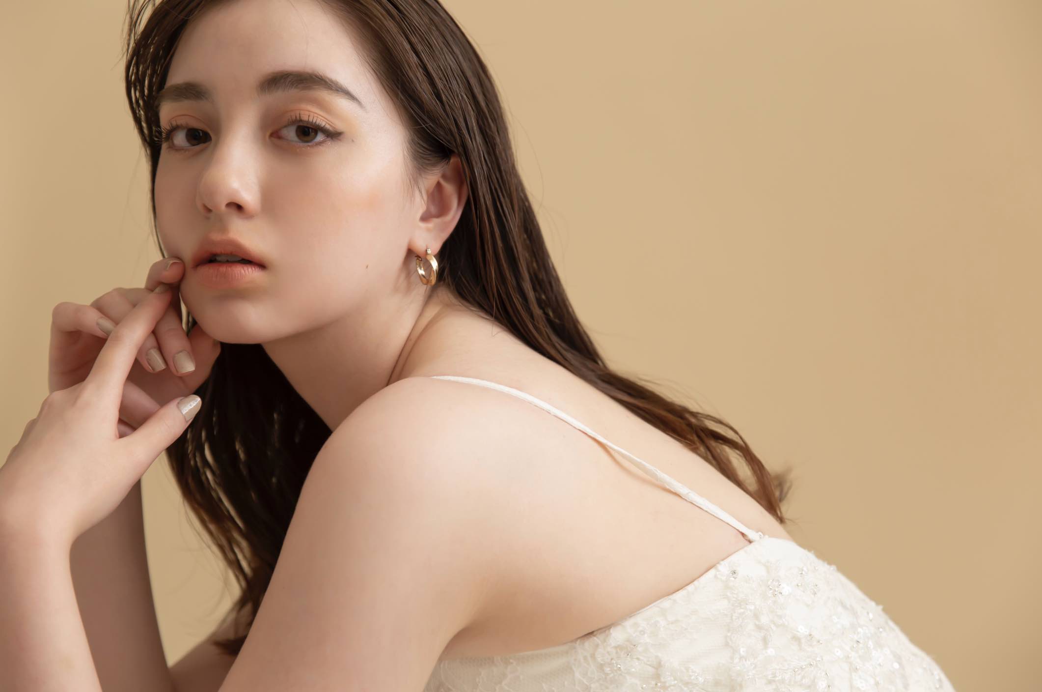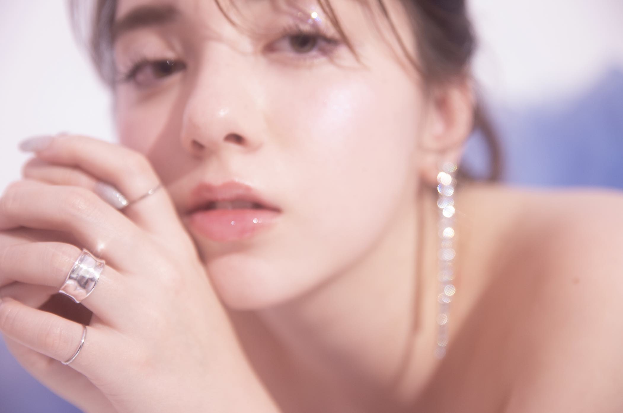 透明感あふれるつや肌にちゅるんとしたリップとぽってりチーク。