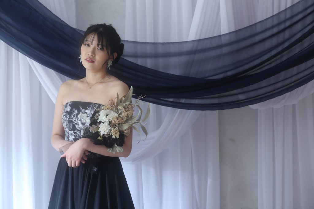 黒ドレスにしっとりとした質感のあるVOWSの背景で高級感溢れる雰囲気に・・・