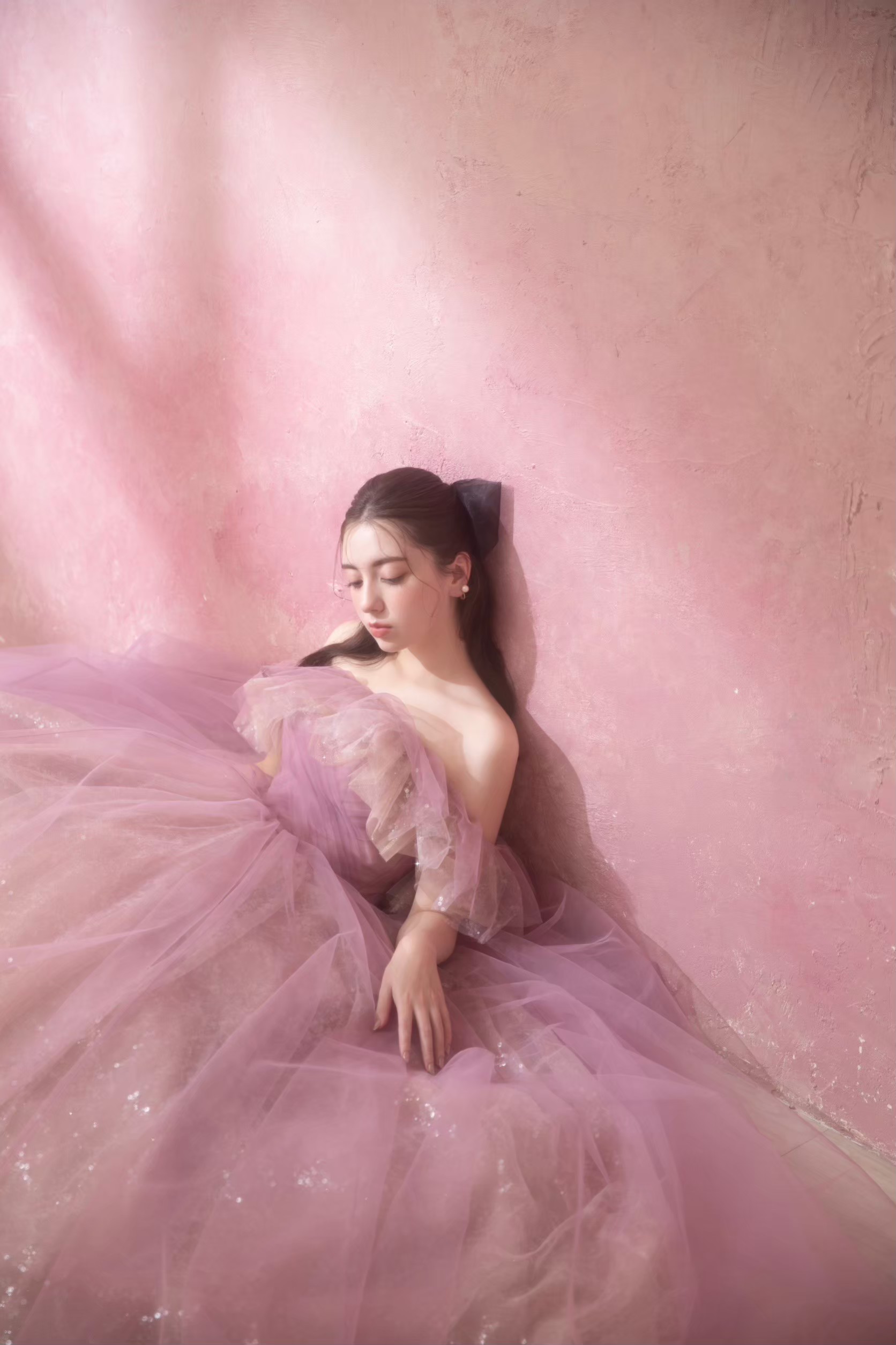 ピンク壁とキラキラのピンクドレスを合わせたスイートなビジュアル♡