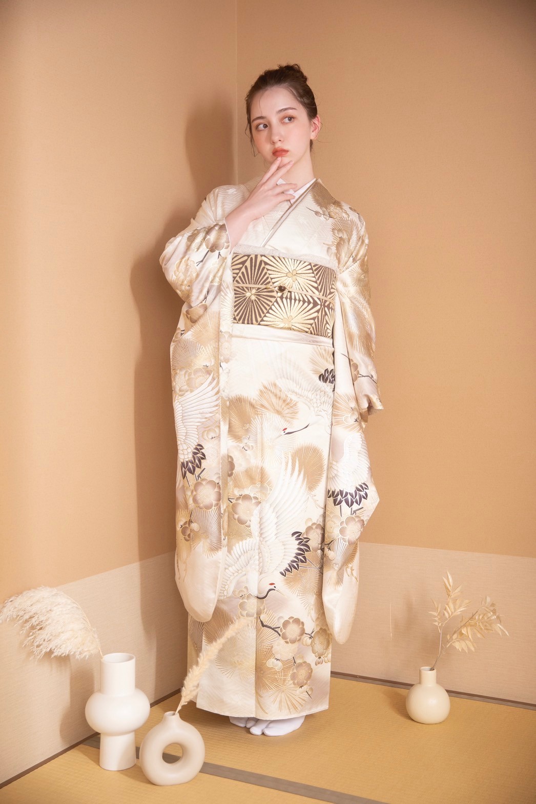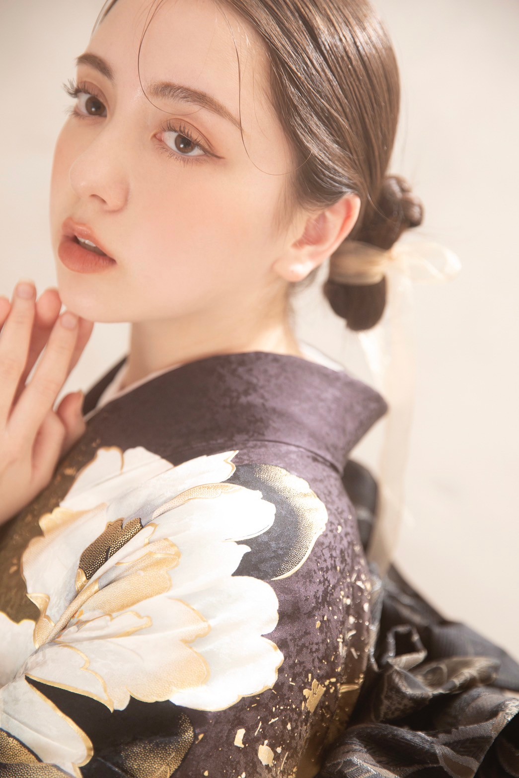 白×ゴールドの品のあるデザインの振袖とブラウンで統一感のあある小物で大人な雰囲気に。