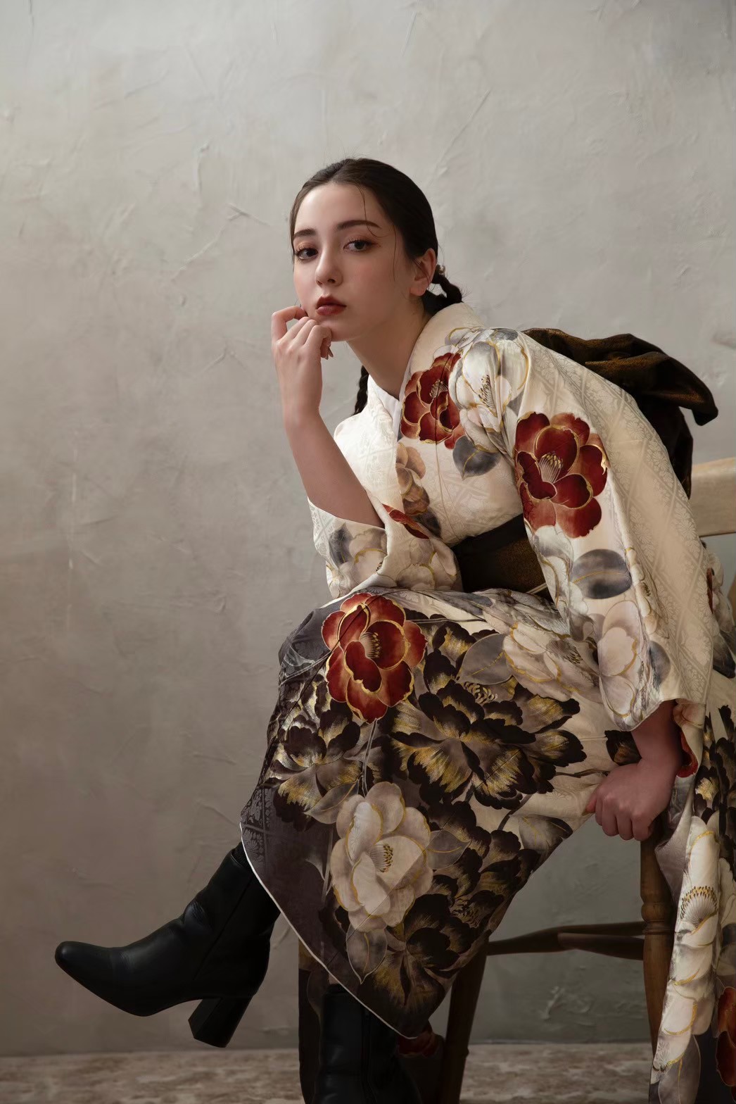 ヘアメイクも深みのある色味を取り入れ、ブーツスタイルでコーディネートしております。