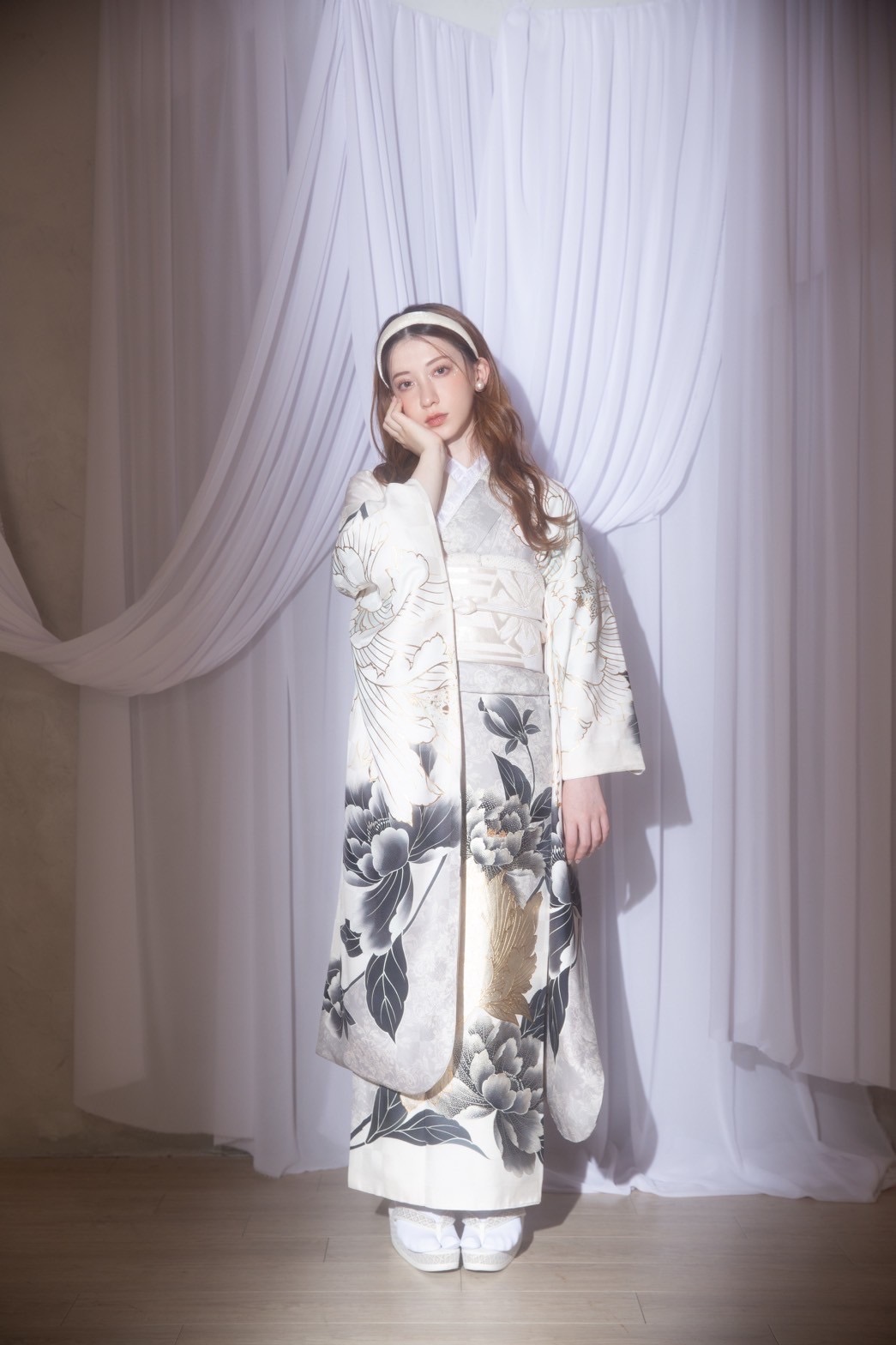 白地に、洋風な柄が入っている今っぽい振袖となっております。