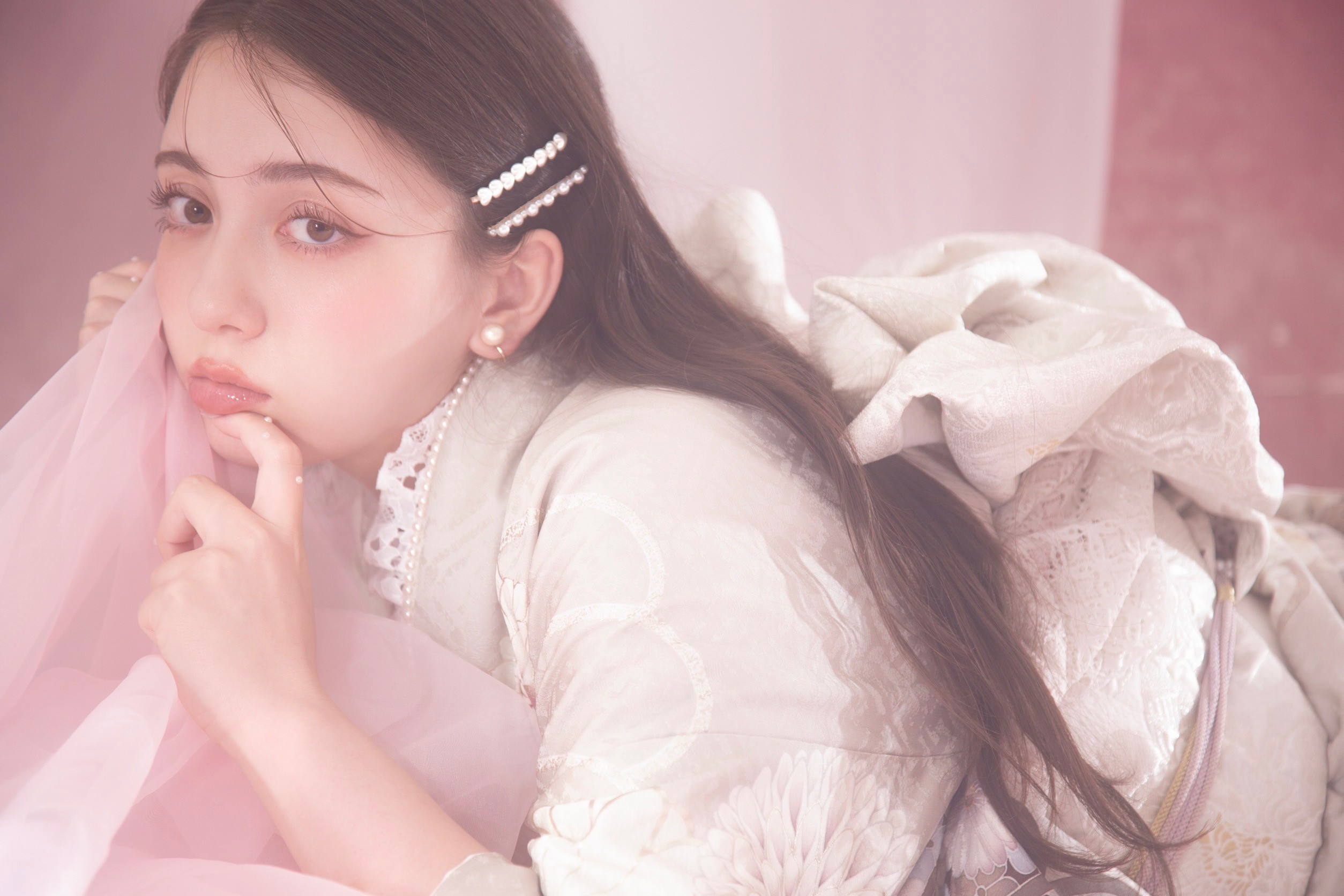 ダウンスタイルにパールのピンを付け、
