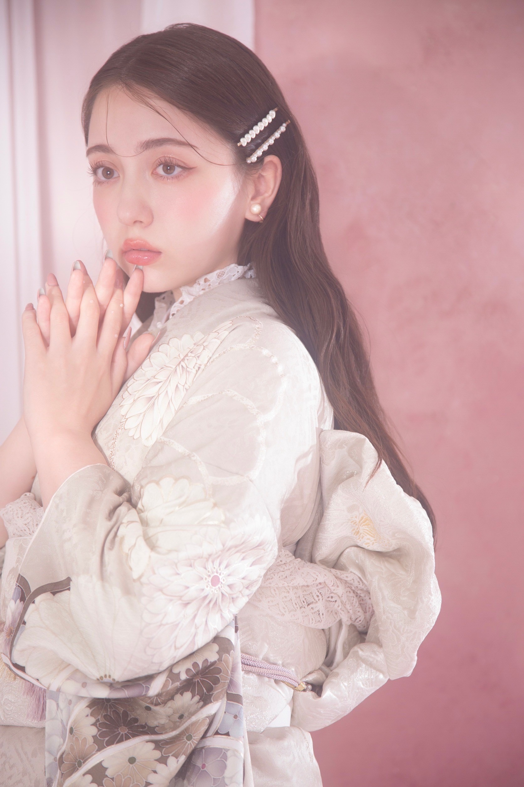 最後にこちらのスタイルを紹介します!細かくウェーブではなく大きくゆるい感じのウェーブヘアとこの白っぽいガーリーな振袖の相性は抜群でとても可愛らしくふわふわな雰囲気で着こなすことができます❤︎ダウンスタイルでもヘアアクセサリーにもこだわってあげると一段と可愛らしく、周りのお友達よりも差をつけることができます✨