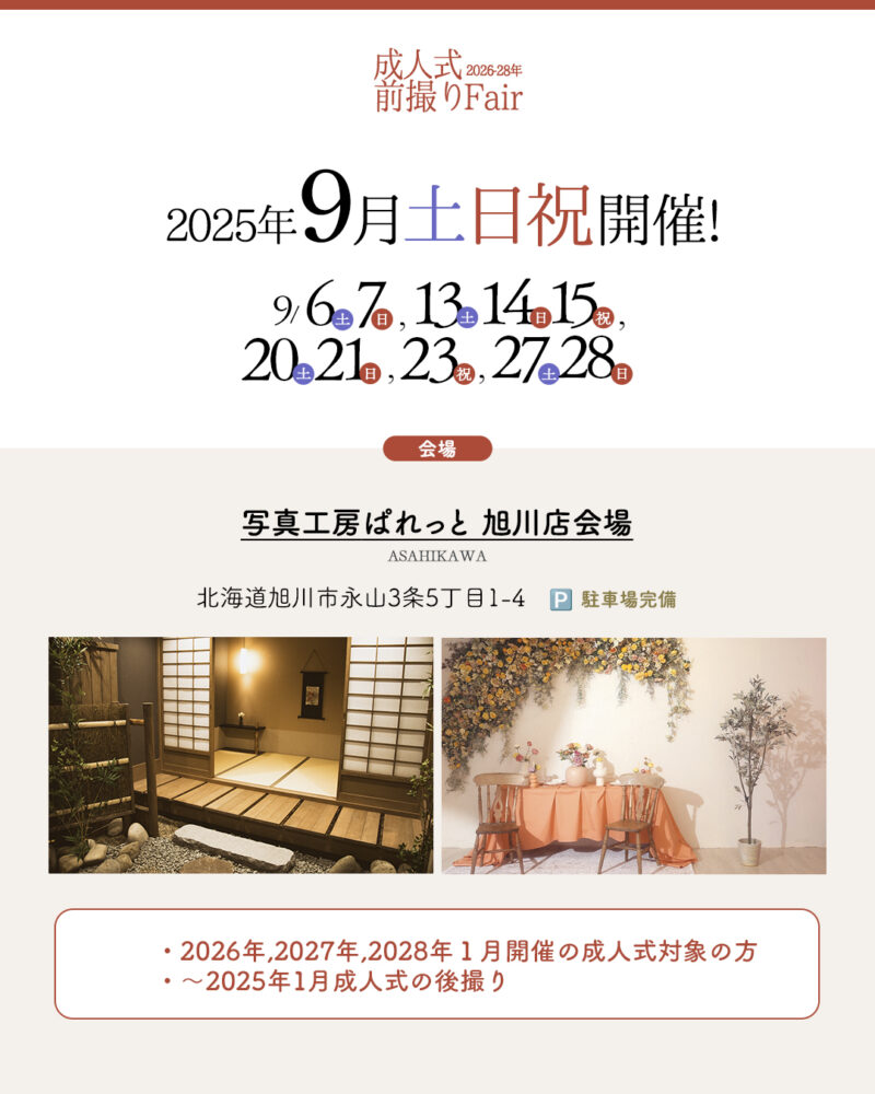 写真工房ぱれっと旭川店では毎週土日祝限定で「前撮りフェア」を開催中!