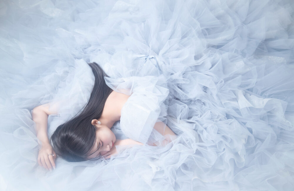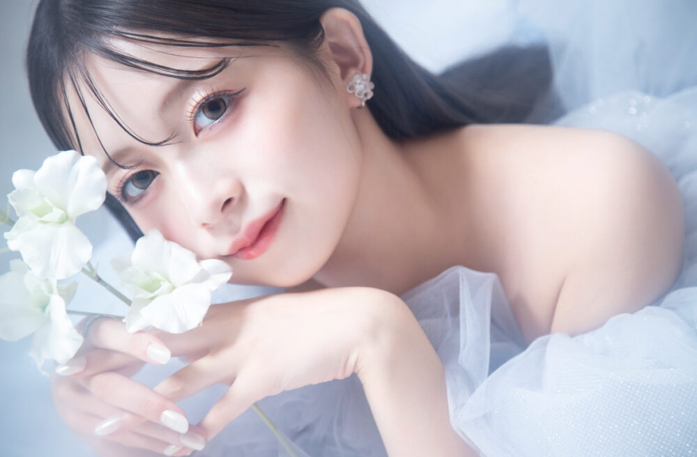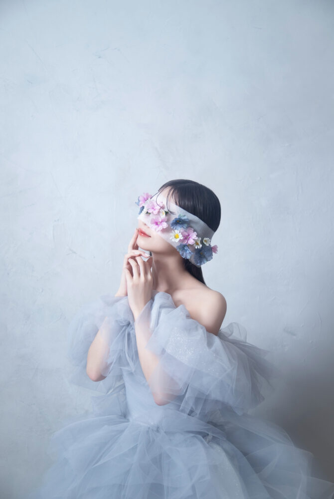 優雅さと透明感を兼ね備えたデザインは、花嫁や成人様の可憐さや内面の静けさを引き立て、まるで絵画や夢のワンシーンのよう。