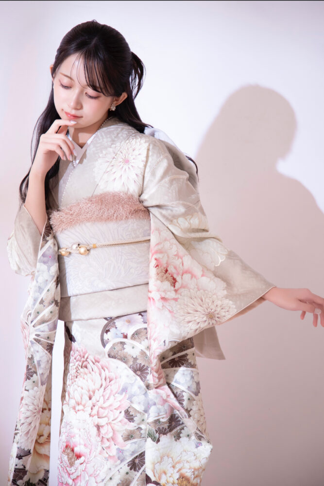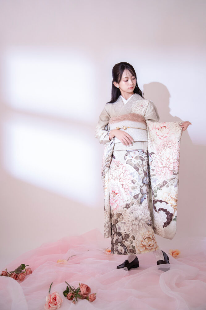 コーディネートは、淡いグレージュ系に大きな菊などが描かれた華やかでエレガントな振袖に小物を同系色で合わせてさりげなく可愛さをプラス。
