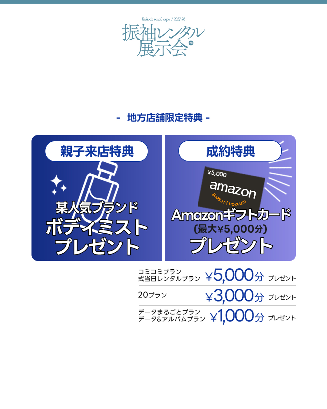 1/31(土)&2/1(日)の2日間限定で展示会の開催が決定いたしました! 対象者は、2027年、2028年1月開催の成人式に参加予定の方! ※撮影のみプランも取扱中。 まだ振袖が決まっていない とりあえずどんな衣装があるか見てみたい…! というお客様は、ぜひこの機会にご来店ください