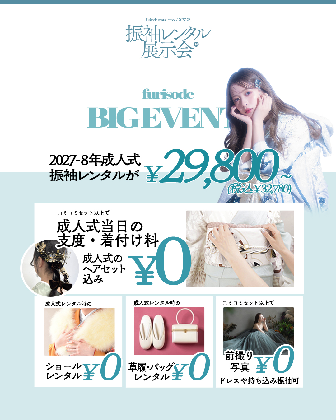 2027年・2028年の成人式に向けた振袖レンタルは、29,800円(税込32,780円)からご利用いただけます。