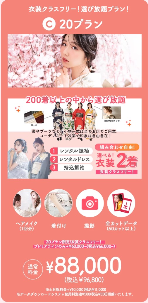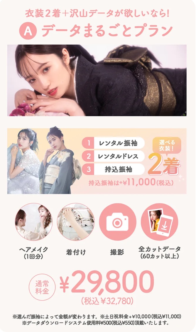 内容:持込振袖 + プレミア衣装1着選び放題 + 全データ + 最上位シャルムアルバム1冊 + ミニアルバム2冊 + 肌補正レタッチ