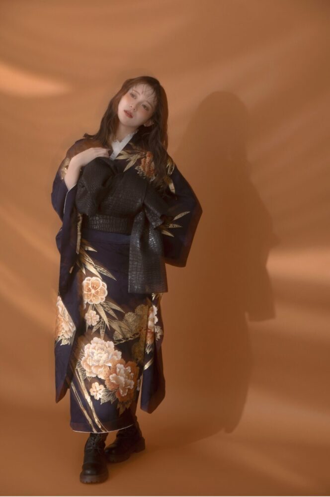 温かみのあるセピアトーンの空間の中で振袖の存在を溶かし込む。