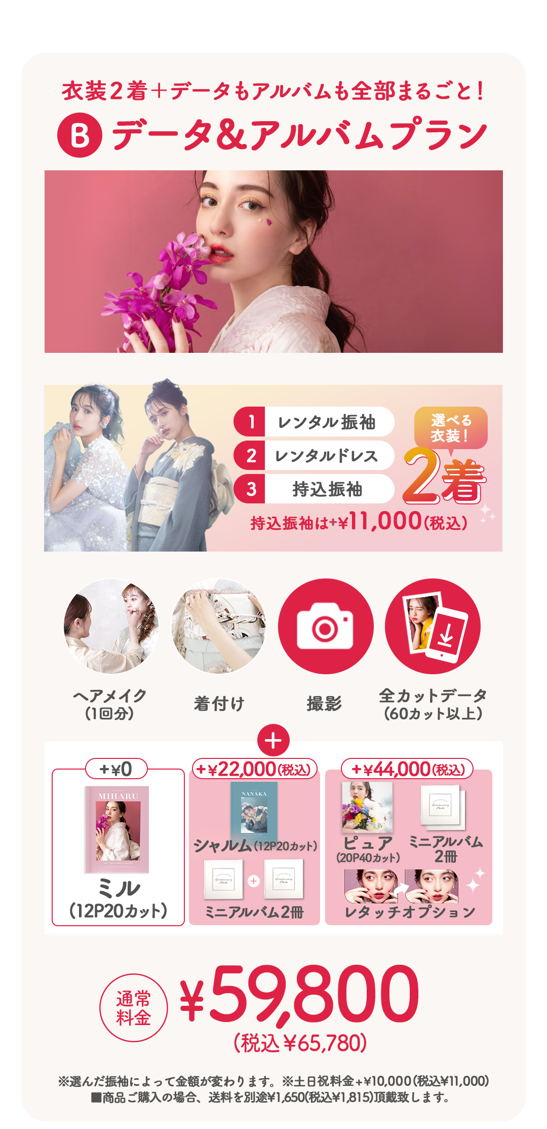 59,800円(+税)〜 。データに加え、お部屋に飾れる可愛いアルバムもセットになった人気プランです 。