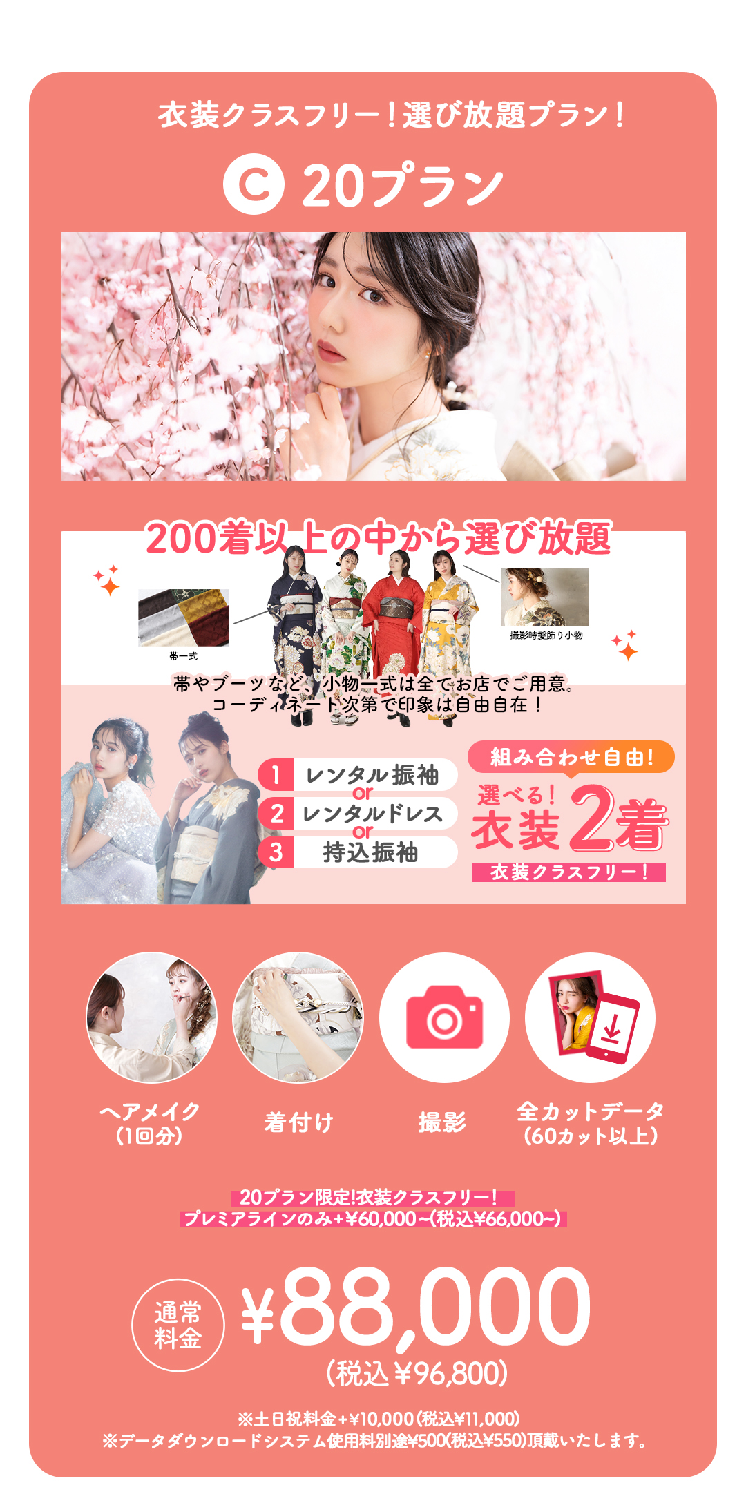 2着分の撮影・衣装・ヘアメイク・着付け込みで29,800円(+税)〜 。60カット以上の全データを即日ダウンロード可能です 。