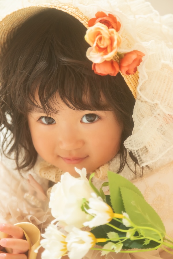 ボンネットとお被布、お花とゴールドのリボンで統一感のあるお写真に🌼