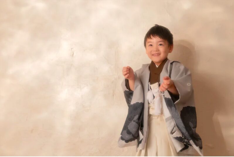5歳になると、ぐっとお兄さんらしくなりますよね。そんな5歳さんには、伝統的な「黒×金」の力強い羽織袴も素敵ですが、あえての「淡色」コーデはいかがですか? こちらは、くすんだ水色(グレー)の羽織に、白の袴を合わせた、とっても上品で優しい雰囲気のコーディネート。 羽織の柄も、黒でシンプルモダンに描かれているのがおしゃれポイントです。 「かっこよさ」と「優しさ」の両方を引き出してくれる、洗練されたスタイル。背景も、お着物の色味に合わせたシンプルなベージュの壁で、お子様の表情を主役にします。