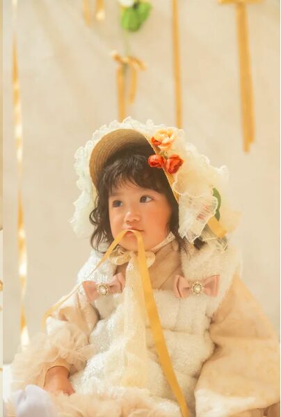 3歳の女の子といえば、赤い着物に白い被布(ひふ)…というイメージはもう古いかも? 今、ぱれっとで大人気なのが、こんな「洋風」スタイルの被布なんです♡ ベージュやオフホワイトでまとめた「くすみカラー」コーデは、トレンド感抜群。ふわふわのレースを使った被布ベストに、フリルたっぷりのブラウス、そしてレースとお花があしらわれた麦わら帽子(ボンネット)…。 まるで絵本の世界から飛び出してきたような、儚げで愛らしい姿に、スタッフもメロメロです♡