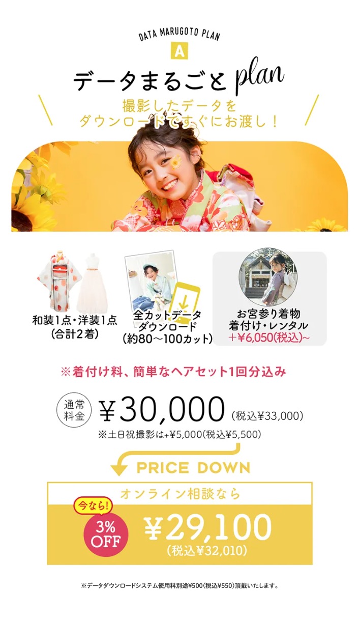 ※すべてのプランにおいて、土日祝日の撮影は別途5,000円(+税)、**データダウンロードシステム使用料として500円(+税)**を頂戴します。