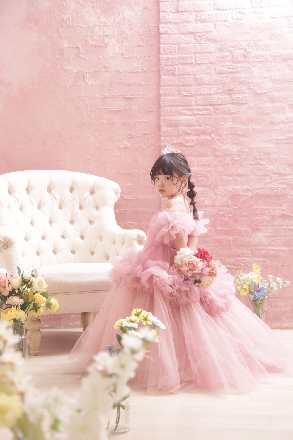 ぱれっとの新作ドレスは、大人ドレスを手がけるブランドから買い付けた、今までにない質感と魅力を放つものばかりです。従来の記念写真スタジオの既製品とは一線を画す、高品質なデザインは、他スタジオでは真似できない独自性を確立しています。