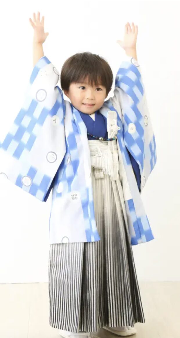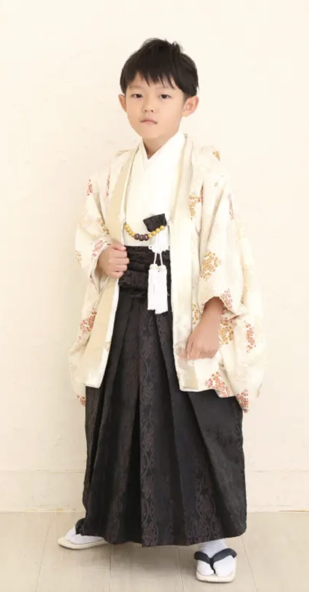 5歳(男の子):凛々しい「袴(はかま)」スタイルが定番です 。最近では古典的な柄だけでなく、現代的な色使いの袴も人気です。