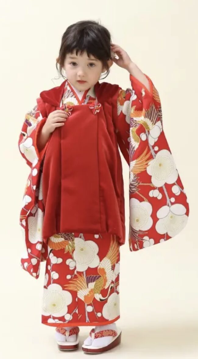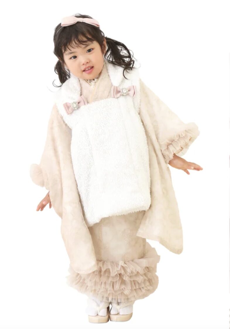 3歳(女の子・男の子):帯を締めず、着物の上に「被布(ひふ)」というベストのような形をした上着を羽織るスタイルが一般的です。小さなお子様でも負担が少なく、3歳ならではの愛らしさが引き立ちます。