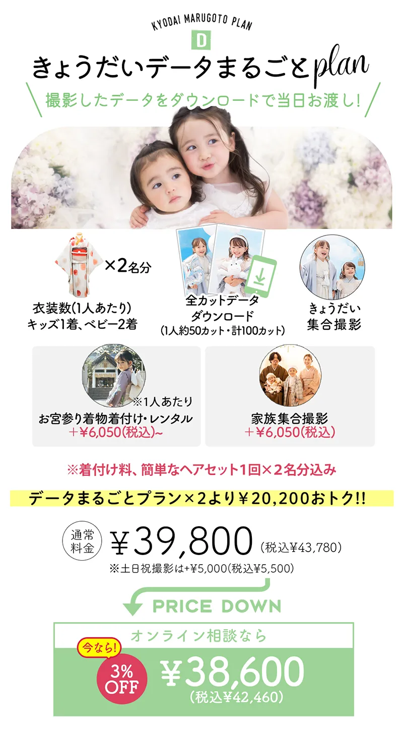きょうだい同時撮影:例えば、小学校入学記念と七五三を一度に済ませられる「マルチ撮影」が効率的で人気です 。