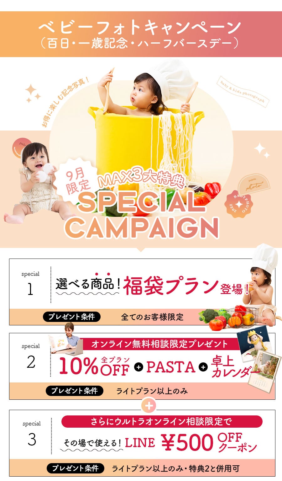 ※特典の対象は、百日、ハーフバースデー、1歳、七五三撮影になります