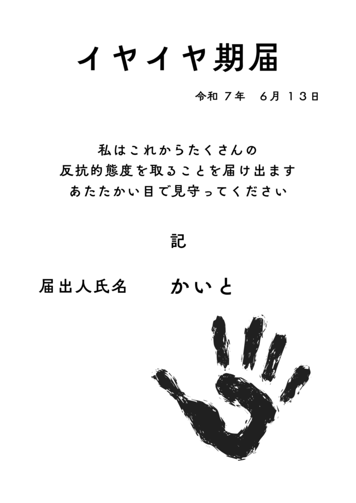 イヤイヤ宣言として専用用紙に手形を捺印し正式にイヤイヤ期を証明しましょう✨